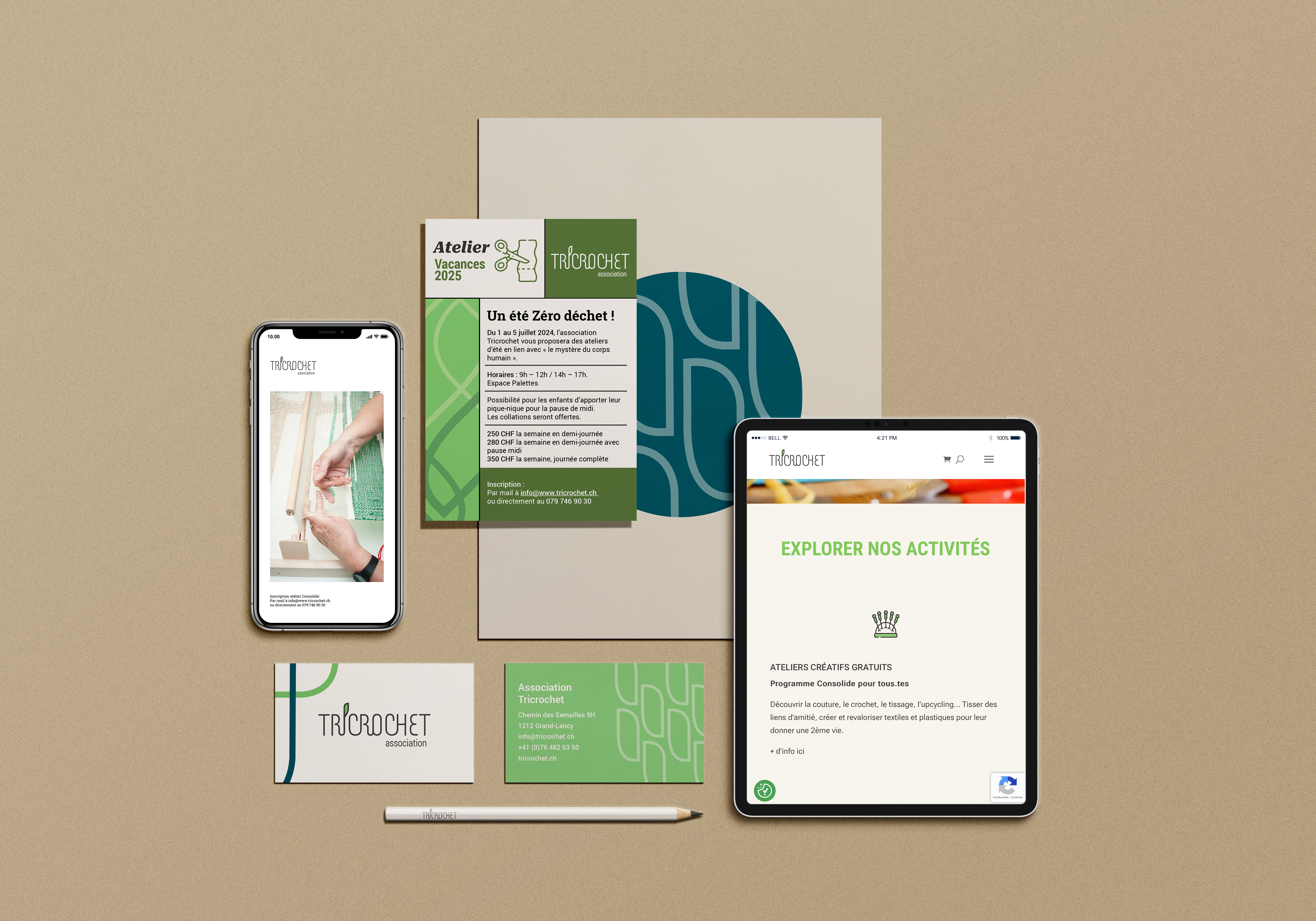 Tricrochet est une association genevoise qui favorise l’intégration sociale et la sensibilisation environnementale à travers des ateliers de couture, tissage et upcycling. Studio Maga a développé une refonte complète de leur identité visuelle, créant un univers graphique moderne et engagé, puis a conçu un site internet sur mesure intégrant boutique en ligne, système de donations et blog pour accompagner leur croissance et renforcer leur présence digitale.